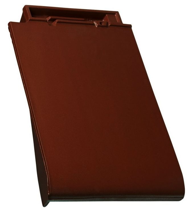 Taška okrajová levá - konstrukčně nejlepší řešení bočního ukončení střechy představují okrajové tašky. Tvoří ideální ochranu štítu do stran tvarovanou bočnicí. Při krycích délkách pod 360 mm je nutné upravit levý resp. pravý horní roh řezem.
