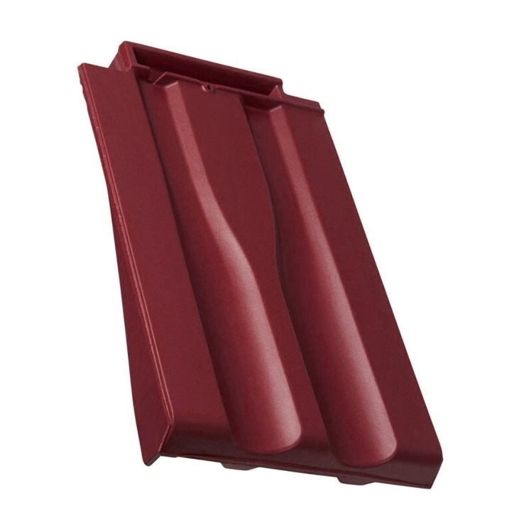 Taška okrajová levá – konstrukčně nejlepší řešení bočního ukončení střechy představují okrajové tašky. Tvoří ideální ochranu štítu do stran tvarovanou bočnicí. Výška štítové bočnice je v rozmezí 50–80 mm. Při krycí délce v rozmezí 340–390 mm je nutné upravit tašku řezem v levé horní části.